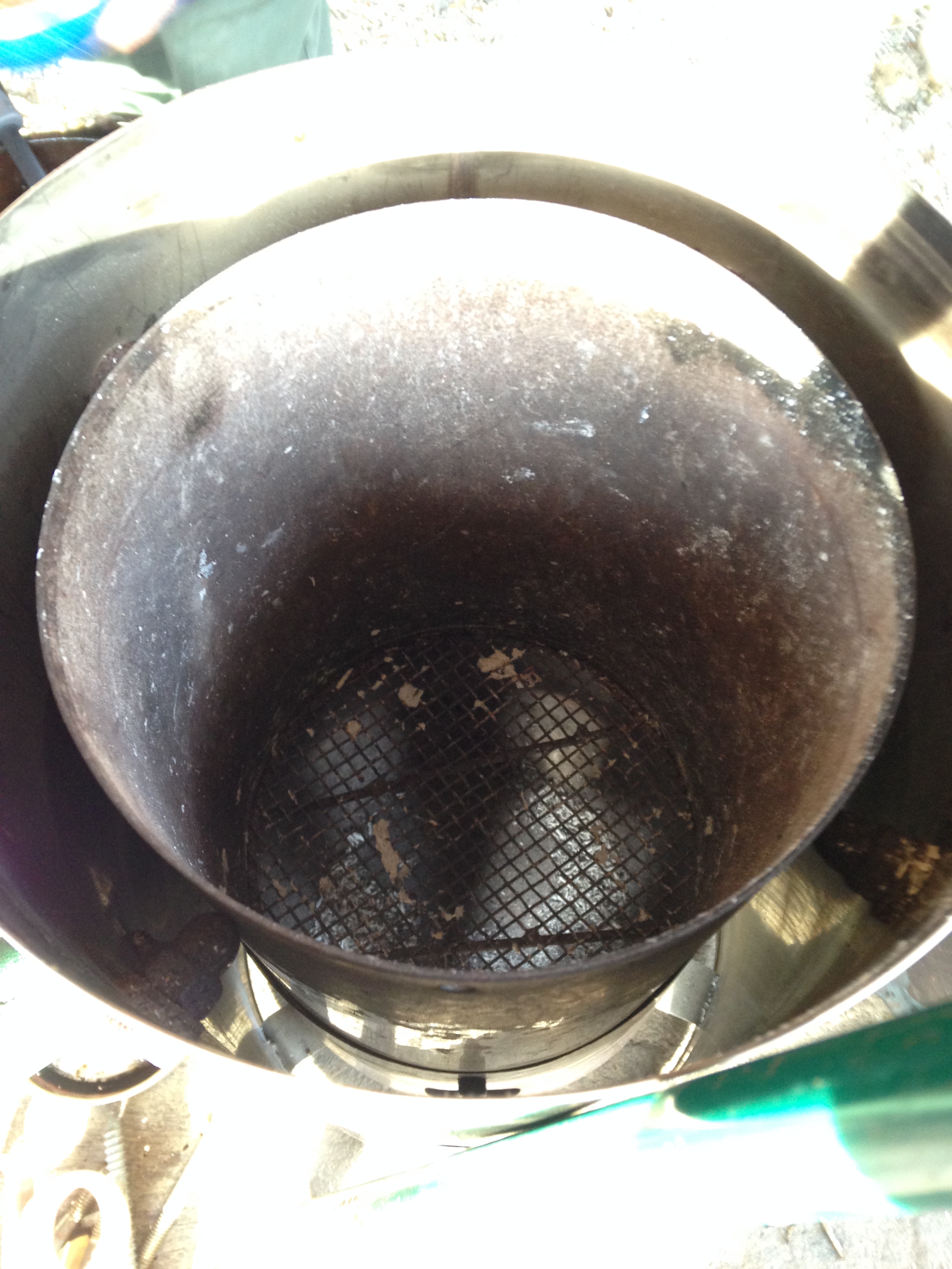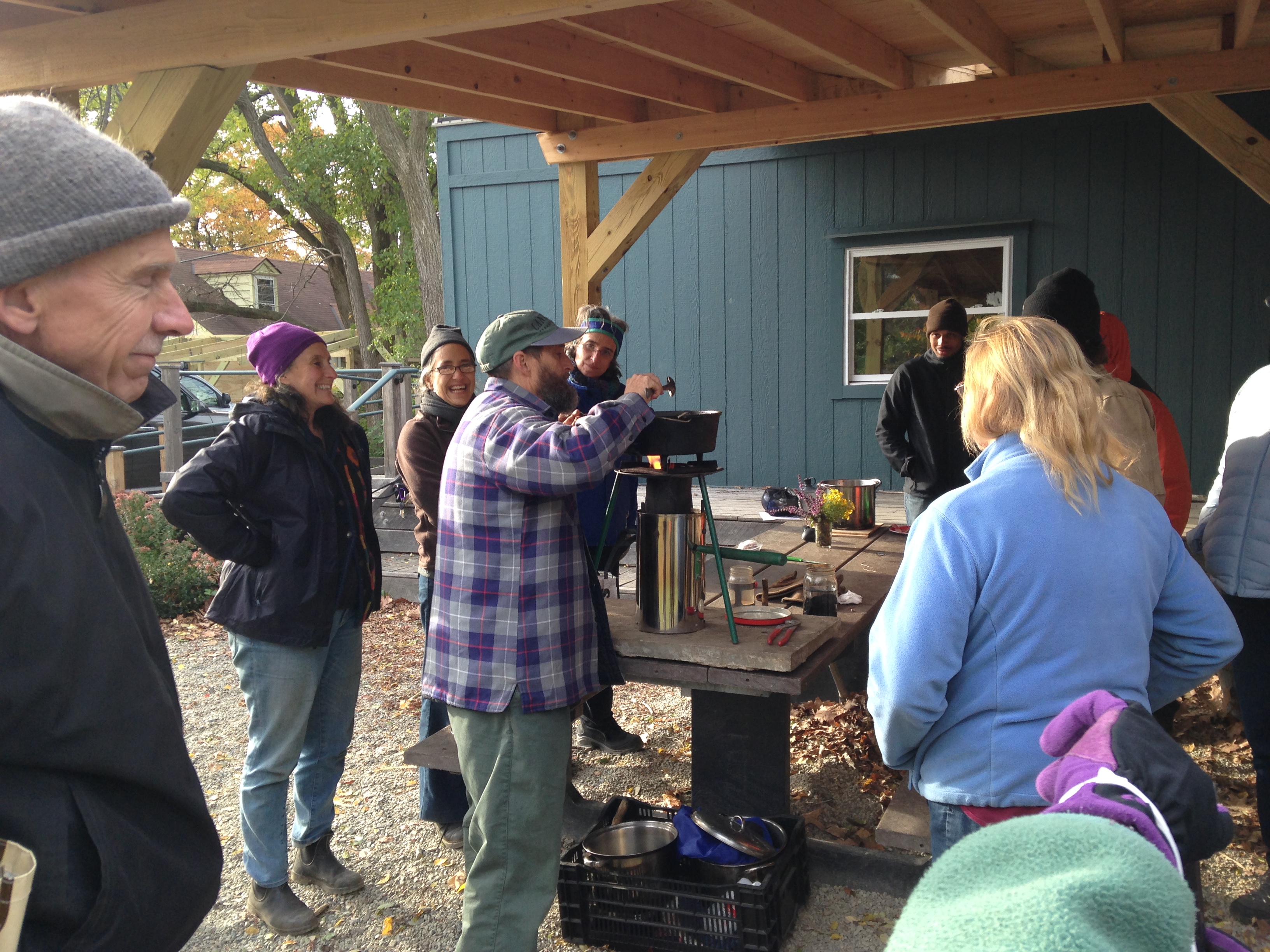 On November 8th, at Awbury Agricultural Village, Dale Hendricks gave a class titled Biochar – A Climate Change Solution? The $25 class started with a lecture about biochar, what it is, and what role it can play in building healthy soils and sequestering carbon. Following the presentation, Dale demonstrated how to set up two different size biochar stoves used for producing biochar, and cooking. We heated up some delicious chili that Dale brought, and some hot chocolate that another class participant brought to share. It was a great opportunity to learn about this great technique, and to meet other people who share the interest in creating healthy soil. Biochar is created by burning organic matter, and then as the flames start to die down and the burning material is glowing, you smother the fire with more material to turn into biochar. This deprives the glowing coals of oxygen, resulting in biochar. A primitive way to accomplish this is to dig a large hole, burn a bunch of wood in the hole, and continuously smother the fire with more material to burn. When the fire is eventually put out with water, and the coals cool down, you’re left with biochar. Apparently some native cultures used to do this (likely cooking over the fires), and the soil in those areas has an extremely high carbon content, making rich soils that produce better yields compared to nearby farms without this carbon in the soil.